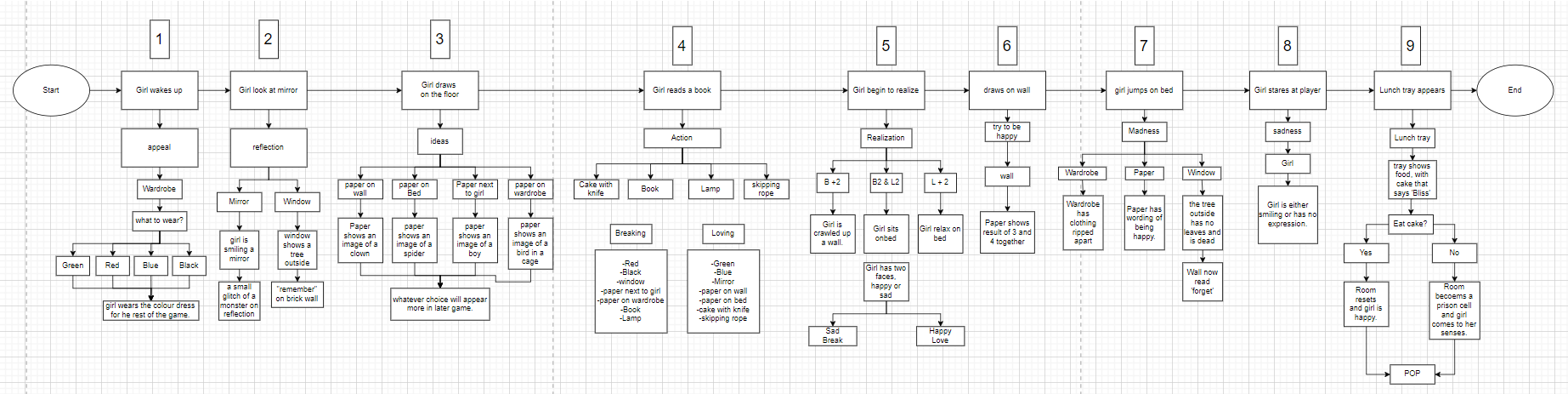 (Note: While 9 sections of interactions were planned, 8 ended up in the game, section 7 and 8 were merged for the sake of scoping. Made on Draw.io)